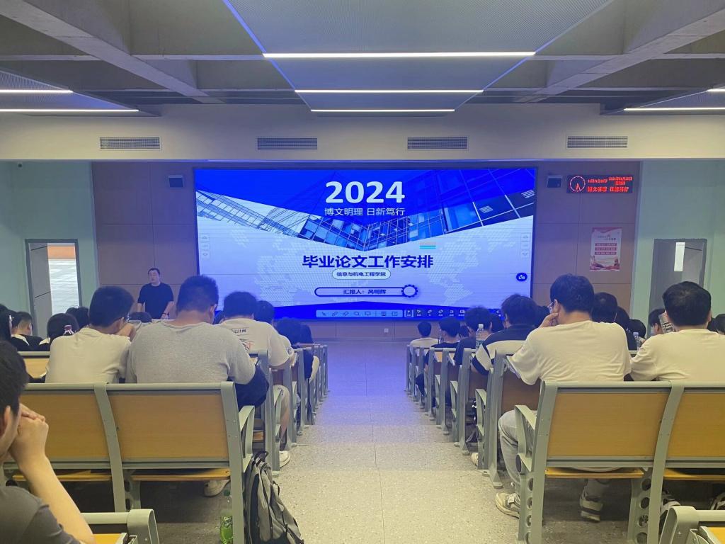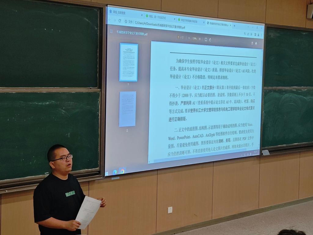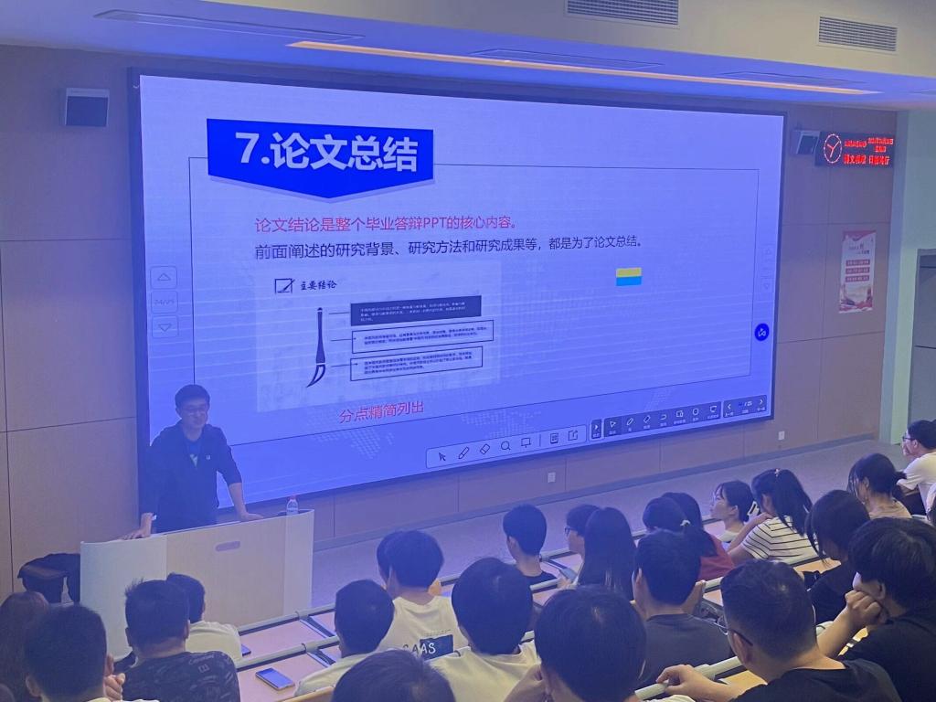 呙明辉结合毕业生毕业实习的实际情况,对毕业生实习中存在的不足进行了总结。他用“理论必须在实践中才能彰显光芒”告诫同学们要学以致用,重视实习实践,不断提高学习能力和实践能力。针对毕业论文写作安排,他引用相关政策规定,阐述了毕业论文对学生个人的重要意义,希望同学们能够足够重视和行动,并指出毕业论文与毕业答辩可能存在的常见问题。对毕业论文的规范写作、查重要求和答辩流程一一作了详细讲解,给同学们提供了专业的建议。