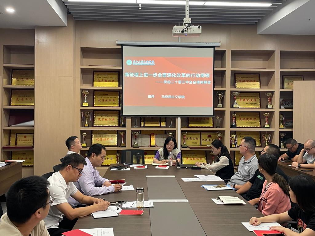 本网讯 (通讯员 汪紫薇)为了深入学习贯彻党的二十届三中全会精神,切实把全院师生思想和行动统一到学习贯彻大会精神上来,按照学校党委统一部署,我院于10月10日下午,在图书馆510会议室举办学习贯彻党的二十届三中全会精神宣讲会。特邀学校宣传团成员、马克思主义学院副院长田丹副教授作《新征程上进一步全面深化改革的行动纲领——党的二十届三中全会精神解读》专题宣讲。我院党总支书记吴海良主持宣讲会。