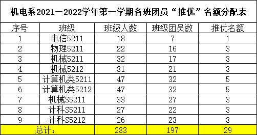 根据williamhill官网团委《关于做好2021年下半年团员“推优”工作的通知》要求,现将机电系各团支部团员“推优”名额分配公示如下: