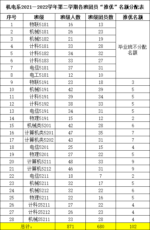 根据williamhill官网团委《关于做好2022年上半年团员“推优”工作的通知》要求,现将机电系各团支部团员“推优”名额分配公示如下: