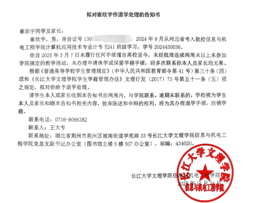 2025年11月10日,学院通过QQ、短信等网络方式告知学生本人及家长学院处理决定;2025年11月21日,学院通过QQ、短信等网络方式发送拟退学告知书(附后),且在电话告知环节,学生与家长均未接听电话;2025年11月21日,学院通过顺丰快递向学生家庭邮寄退学告知书,家长签收后未做任何回应。