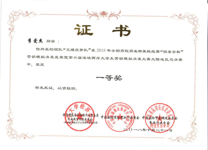 全国高校商业精英挑战赛“国泰安杯”营销模拟决策竞赛暨第六届海峡两岸大学生营销模拟决策大赛大陆地区总决赛 一等奖