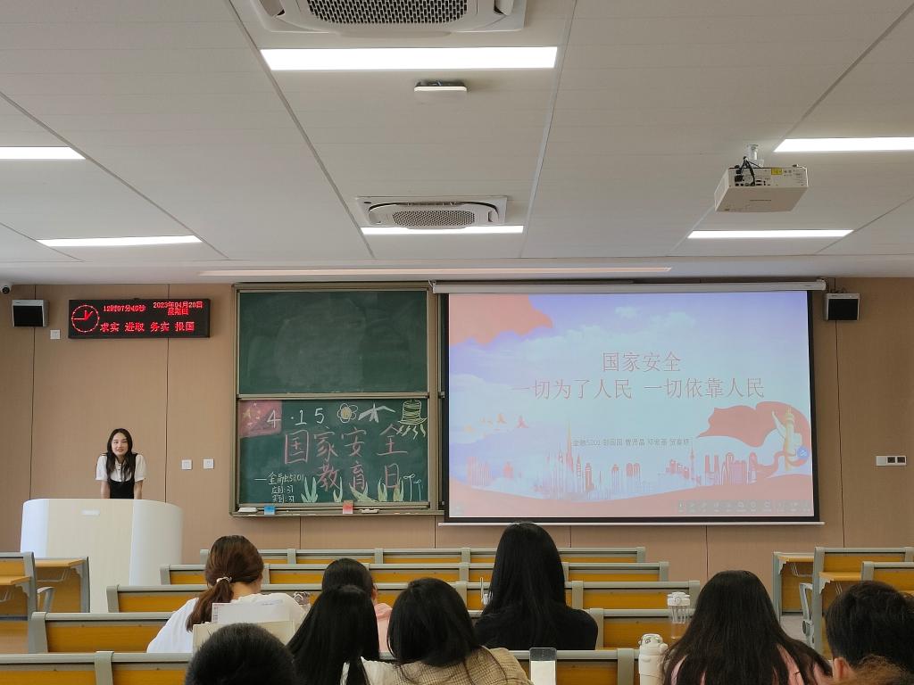 法学5201班主持人带领同学们认真学习了《国家安全法》《网络安全法》《反间谍法》等国家安全相关法律法规,明确什么是危害国家安全的行为、公民和组织维护国家安全的义务和权利,以及危害国家安全的法律责任等等,进一步增强法律意识和国家安全意识,增强维护国家安全的责任感、义务感和荣誉感;国贸5211班围绕“什么是国家安全,国家安全包括哪些方面”等问题展开讨论,同学们积极给予回应,进一步树立国家安全危机意识和敌情意识,做到居安思危,防患未然;同时,借此机会其他各班也加强了防溺水、防暴恐、防火灾、防食物中毒、防拥挤踩踏、防交通事故等方面的安全教育,突出安全教育的实效性,真正使安全知识入脑入心,进一步提高同学们的安全防范意识和应急避险能力。