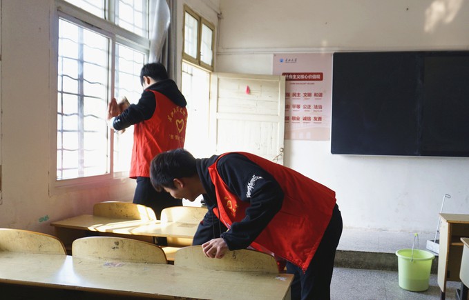 本网讯(通讯员 邱媛丹)为了树立和巩固同学们的主人公意识,为同学们美化教学楼、培养大学生良好的卫生习惯,营造一片文明健康的学习氛围。11月23日上午,经法系青年志愿者对二教201、202、203、204、205、206及四教300教室进行了深度清洁。
