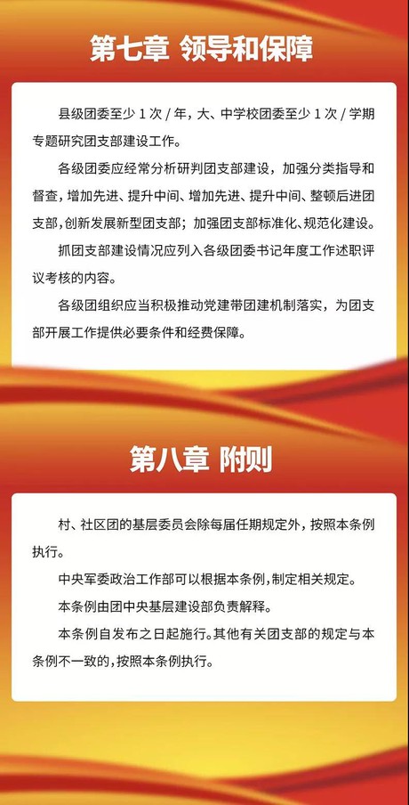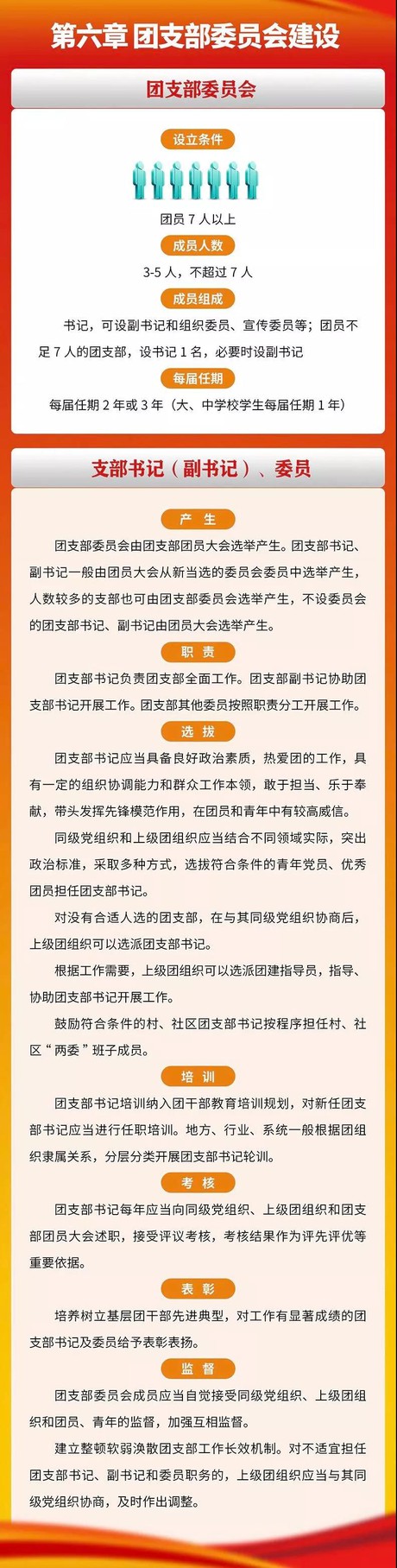 近日,共青团中央印发了《中国共产主义青年团支部工作条例(试行)》(以下简称《条例》),并发出通知,要求各级团组织认真遵照执行。《条例》深入贯彻落实习近平新时代中国特色社会主义思想,特别是习近平总书记关于青年工作的重要思想,是加强新时代团支部建设的重要制度成果,是团的历史上第一部关于团支部工作的基础主干制度,是新时代加强团支部建设的基本规范。为更好地学习掌握《条例》内容并深入领会《条例》精神,我们制作了《条例》图解,带你一起了解《中国共产主义青年团支部工作条例(试行)》。