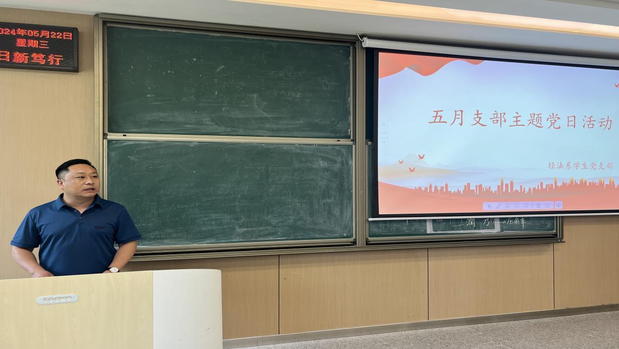 本网讯(学生记者黄春桥)2024年5月22日中午12:00,经法系学生党支部党员、发展对象、入党积极分子在教学楼C-118教室开展五月政治学习和支部主题党日活动。本次会议,由学生党支部书记杨杉杉主持。系党总支书记辛裕出席活动并讲话。