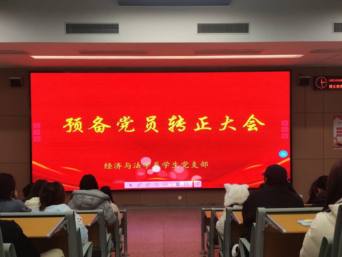 本网讯(学生记者 王小庆)为进一步加强党员队伍建设,增强支部的生机和活力,筑牢基层党组织战斗堡垒,根据支部发展党员工作计划,2024年12月12日,经法系学生党支部在经法系会议室召开预备党员转正大会。经法系学生党支部书记杨杉杉、辅导员卢佳智、刘曼莹及全体党员参会。会议由系学生党支部宣传委员黄春桥主持。