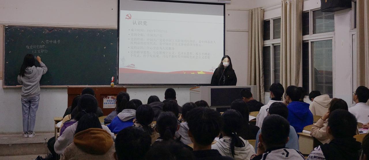本次活动主要是为了激发同学们的入党积极性,了解入党的基本流程以及应当具备的条件。黄佳林、江晟瑀同志通过PPT进行相关内容的讲解。首先,介绍了入党的相关标准及条件。指导大家正确入党。宣传了党的思想作风和政策方针。其次,带领大家去认识党,学习了党的宗旨和指导思想,使大家对党有了更深一步的了解。在此过程中,王嫚、涂思雯同志在黑板上板书了入党申请书的格式,以供同学们学习参考。最后,四位同志一起接受大家的提问并耐心做出解答并对同学们学习上面遇到的问题提出了针对性的建议。