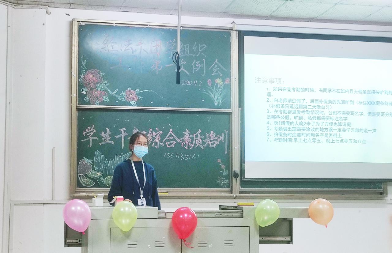 会议第一项,党总支副书记杨杉杉老师为学生干部进行综合素质培训,杨书记从学生干部的作用、选拔、培养与管理等方面,向同学们系统的讲授了作为学生干部应该怎么做。杨书记说学生干部是联系辅导员与学生的纽带,应该成为广大学生的榜样。同时指出,作为学生干部要有充足的心理准备、控制好自己的情绪、学会与人沟通、要做好榜样以及带头遵守规则。杨书记提出“没有规则不成方圆”的原则,一个合格的学生干部自身素养也是必不可少的。最后,杨书记嘱咐各学生干部要认真完成任务、做好老师安排的工作。