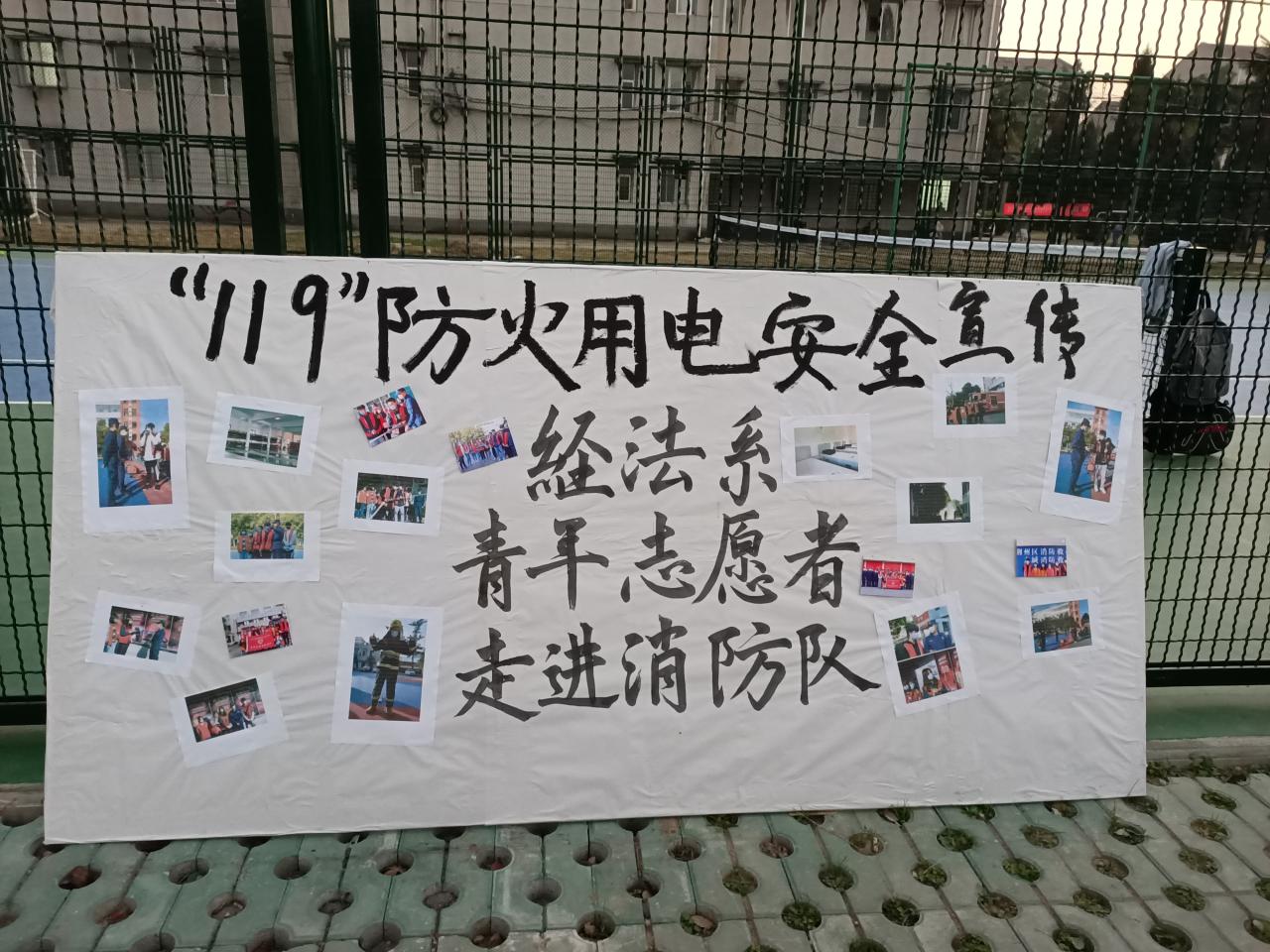 本网讯(通讯员 吴丽妃)在119全国消防日到来之际,为更好打造平安校园,进一步的提高大学生的消防安全意识和树立更好的良好生活习惯。经法系团总支于11月9日至11日在西校区学生12舍楼下篮球场举办了“消防安全119,文明寝室伴我行”的活动。