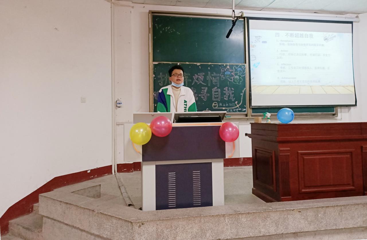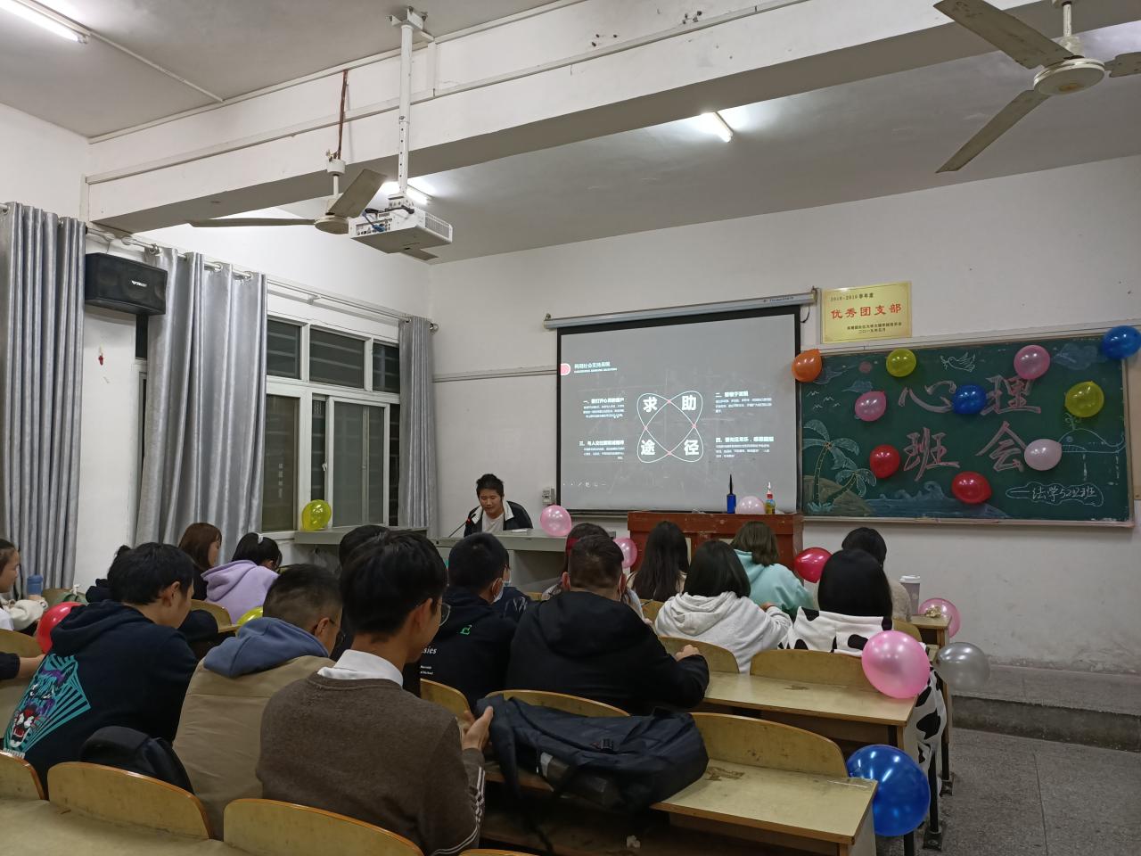 本网讯(通迅员 吴丽妃)为了提高大学生的综合素质、关注大学生的心理健康,积极响应我院第九届大学生心理文化宣传月活动,经法系心灵驿站组织本系18、19、20级学生于11月17日晚在各班级自习教室召开了“抛弃烦恼、找寻自我”的心理主题班会。