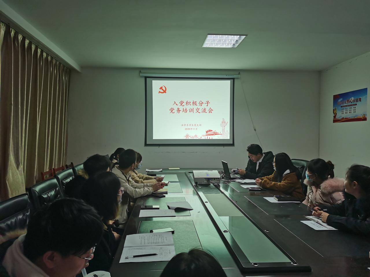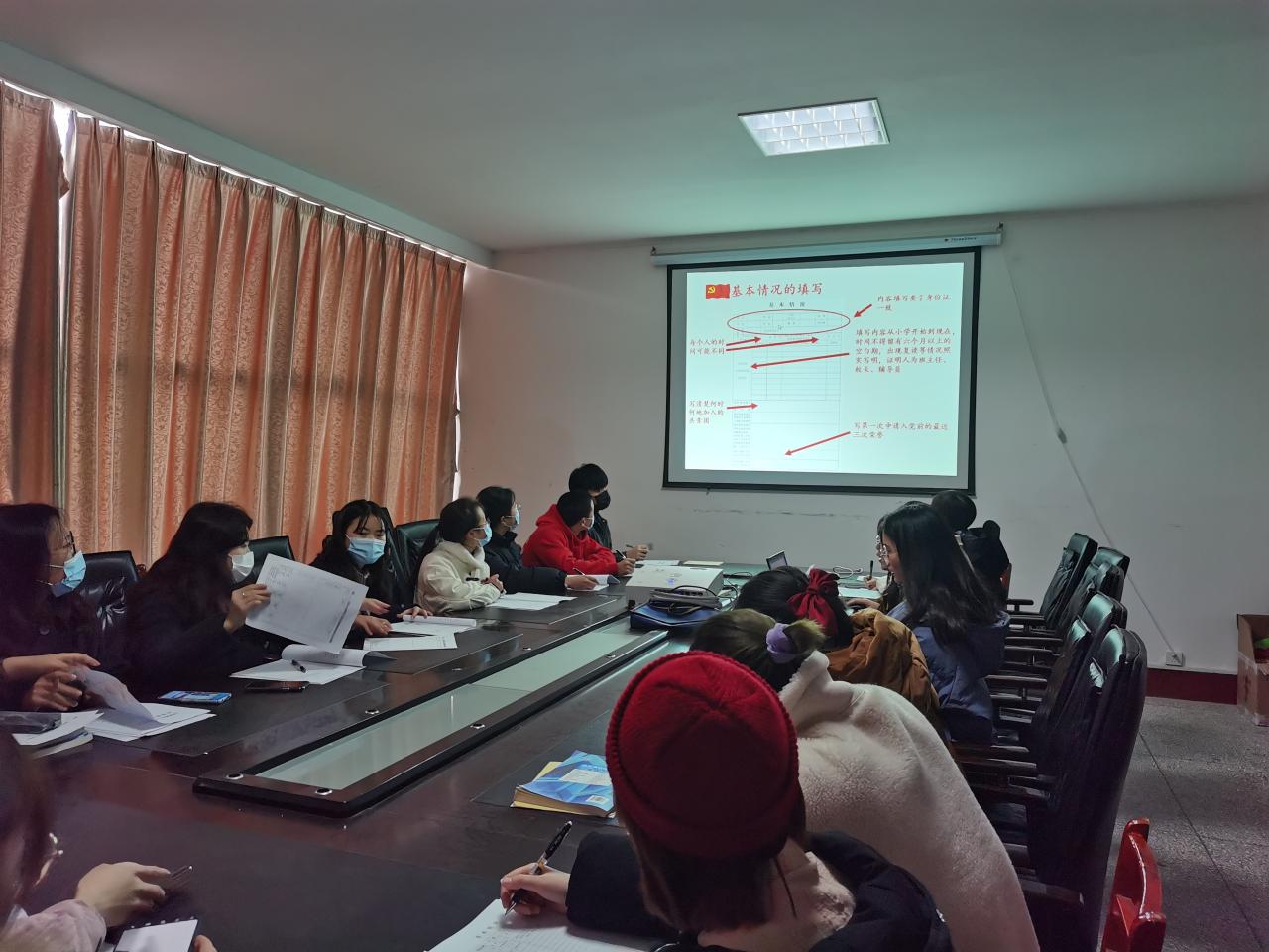 学生党员江晟瑀、黄佳林通过PPT演示向各位入党积极分子讲解了学生党员发展的大致流程与“培养教育考察表”的填写必要:“为什么要进行培养考察”、“从入党积极分子到发展对象再到预备党员需要怎么做需要培养考察多少次”;学生党员涂思雯、王嫚与各入党积极分子进行谈话并记录其思想过程。