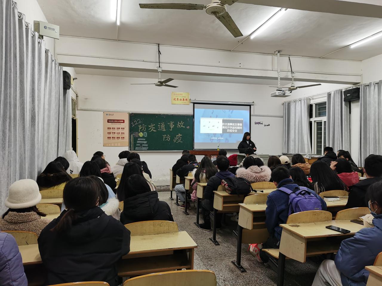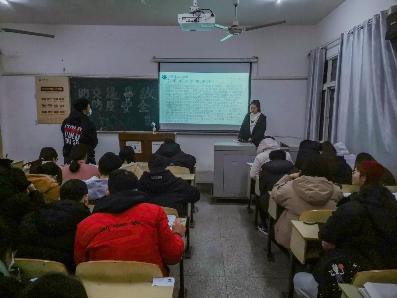 此次班会包括交通安全教育、寒假放假、开学要求及防疫教育等多个方面。主持人用幽默风趣的话语让同学们融入安全教育学习当中。在交通安全教育过程中,提到了大学生交通安全事故的常见现象及原因,并为同学们提出了预防发生交通事故的方法。放假注意事项强调,离校时检查寝室的电源、门窗,以免出现安全隐患,造成财物丢失,同时假期在家要进行钉钉签到,遵纪守法,做一个好公民。在防疫安全教育上,强调大家戴口罩,勤洗手等疫情防护措施。