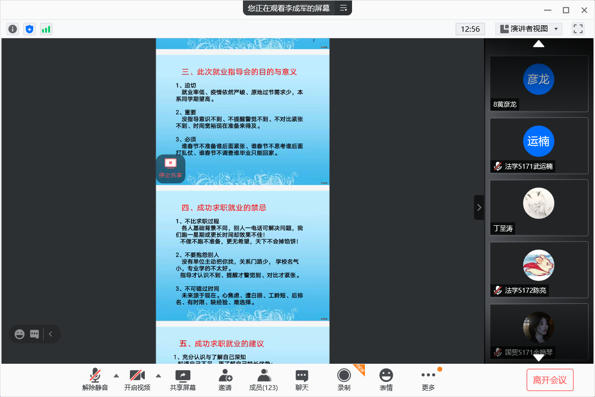 本次会议的召开,同学们了解到当下疫情依然严峻,应当做好个人与家庭防护,积极配合相关地区的疫情防护工作的开展。做好就业的准备,越是艰难越要迎难而上。