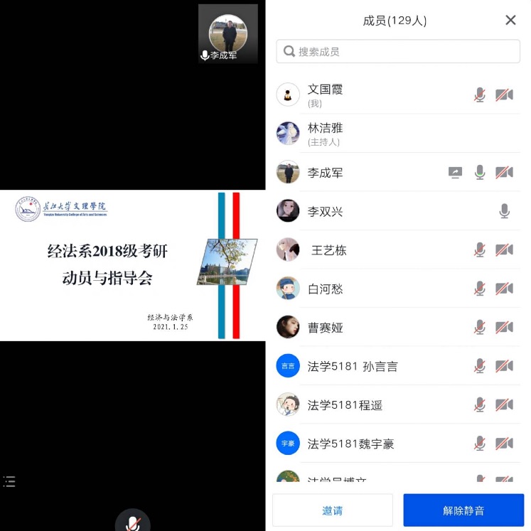 本网讯(学生记者:郁鑫)为考研的同学能够找到正确的备考方向以及做出最好的选择,经法系于1月25日上午,召开了线上2018级考研动员与指导大会,此次会议有幸邀请到李成军书记为同学们系统的讲解有关考试的各项事宜。2018级全体学生参加本次会议。会议在辅导员文国霞老师的主持下进行。