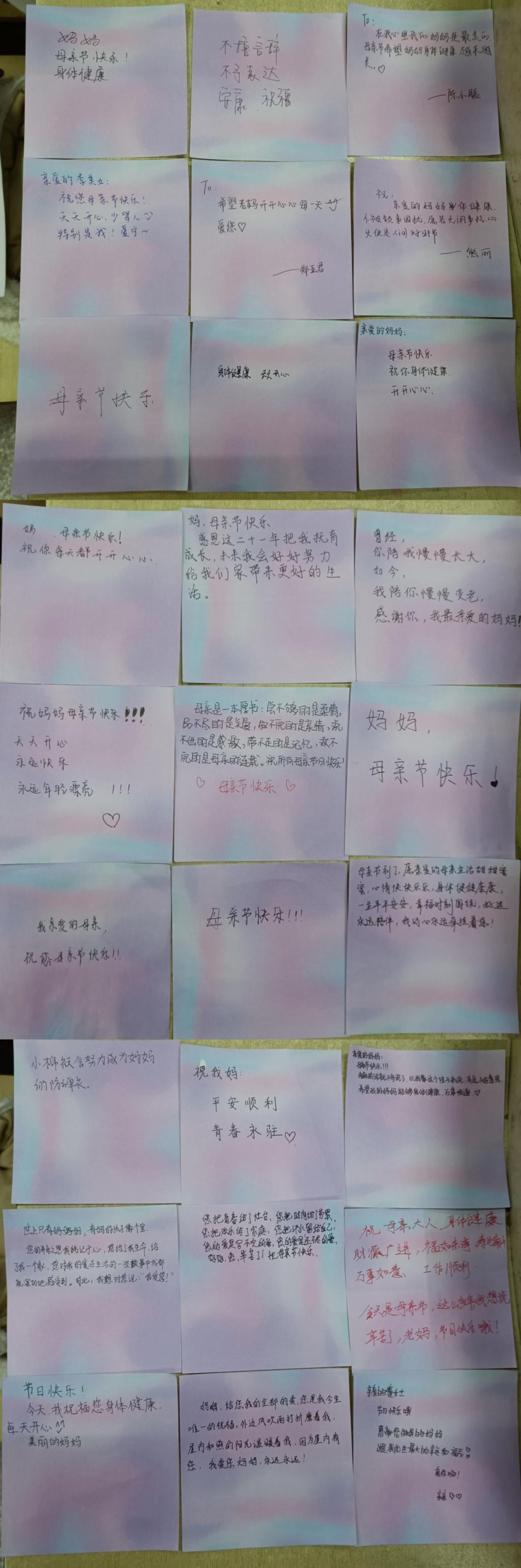 母亲节,通常是五月的第二个星期日。我系同学在母亲节这天,以书信的方式写下祝福妈妈的话语,各班以班级为单位,把写下的祝福以照片的形式发给母亲。