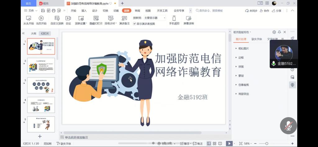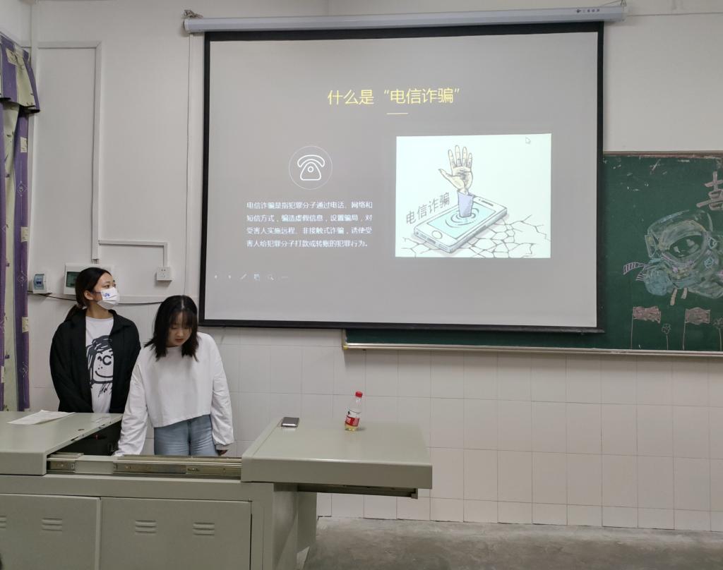 班会开始,主持人向大家说明电信诈骗的含义,让同学们了解电信诈骗的内涵。接着,各班学委分别用PPT、视频及自身经历等为大家介绍电信诈骗的手段和解决办法,主持人特别强调,我们应该不轻信、不透露、不转账、及时报案。