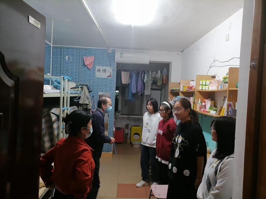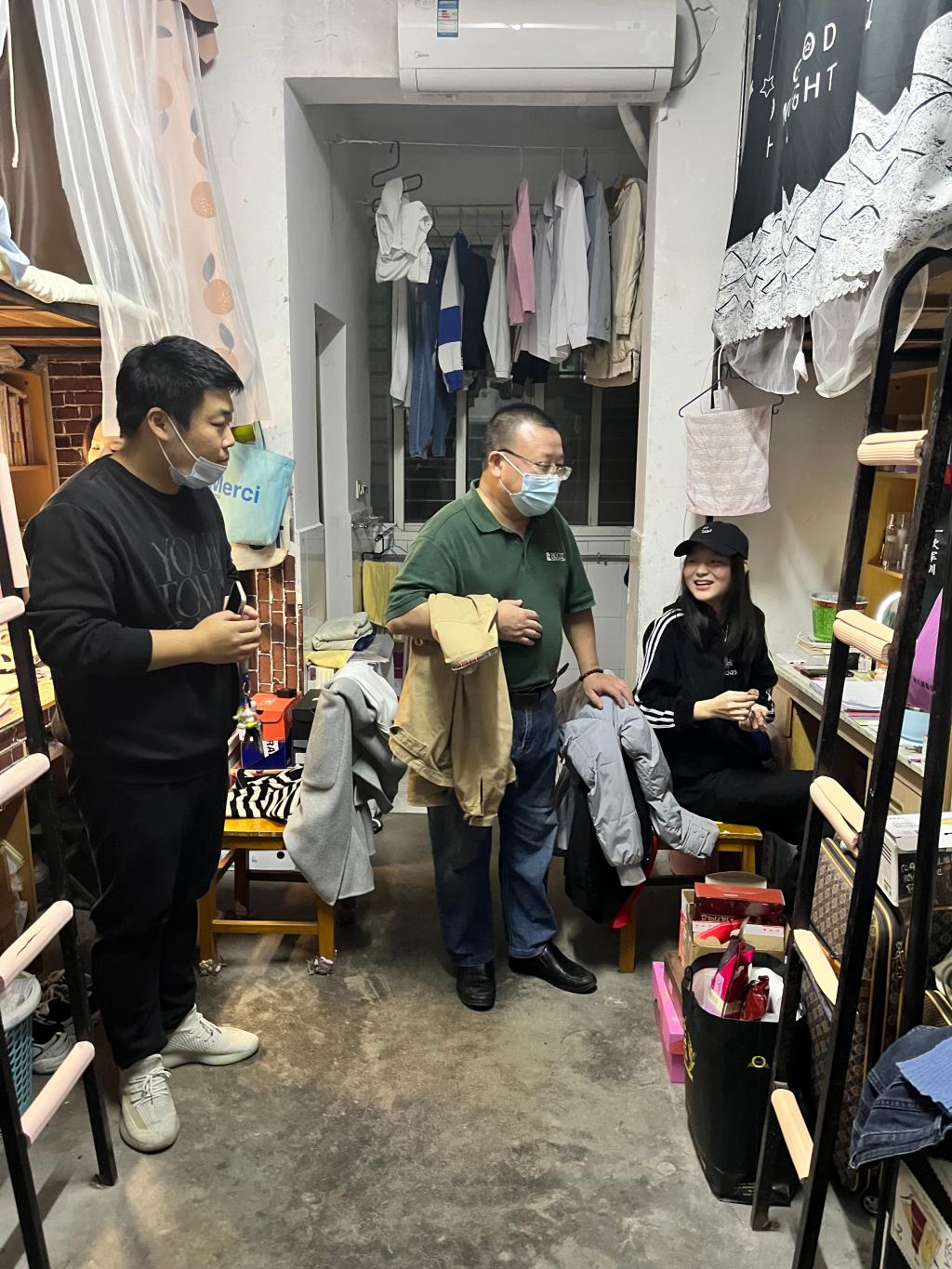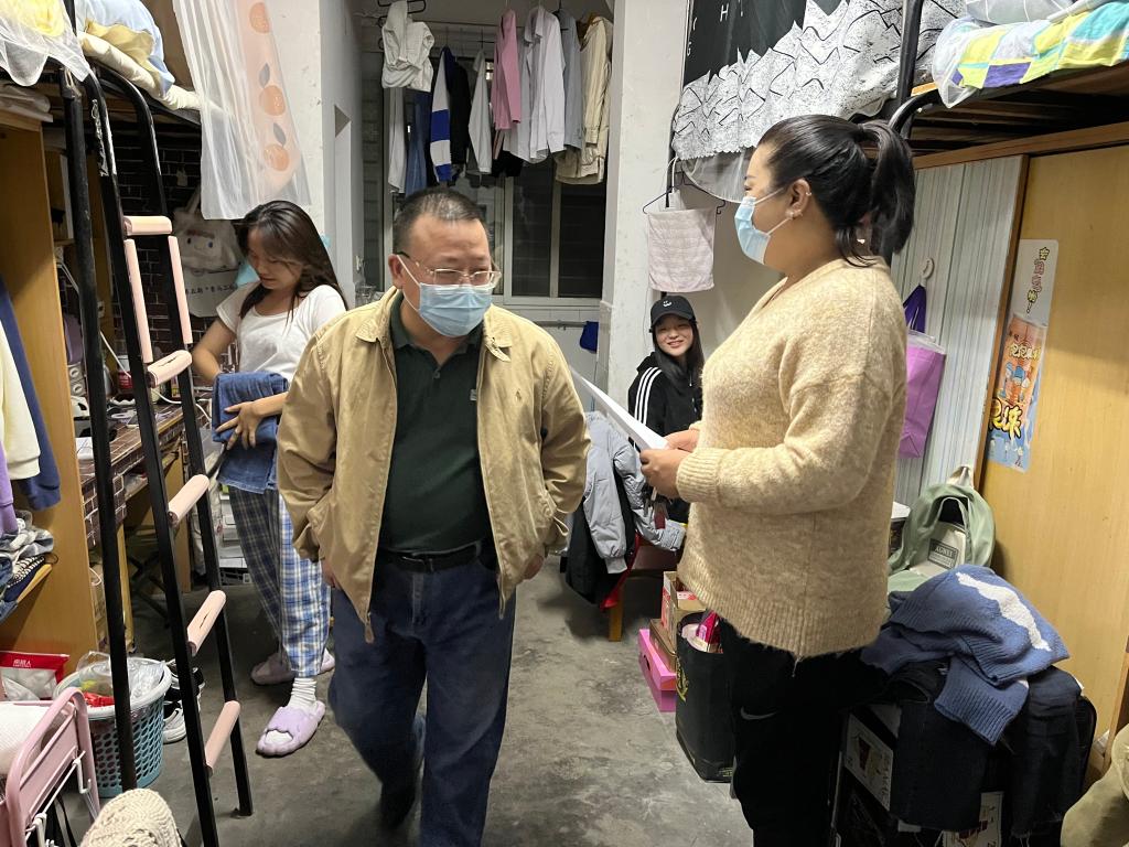 经法系系主任万楚军、党总支书记李成军、党总支副书记杨杉杉和辅导员文国霞、卢佳智在值守期间每天走访学生宿舍,向同学们说明学校的防疫规定,并表示希望同学们共同努力,进一步做好校园疫情防控工作。同时,系主任万楚军、党总支书记李成军提醒同学们,在疫情防控的特殊时期,要坚持健康饮食,保持良好作息,务必做好个人防护,及时监测体温变化,遵守学校防疫要求,准时准点做核酸。在查寝时,两位辅导员老师叮嘱同学们要做好保暖,避免感冒,领导与老师们的关怀给同学们带来了无限温暖。