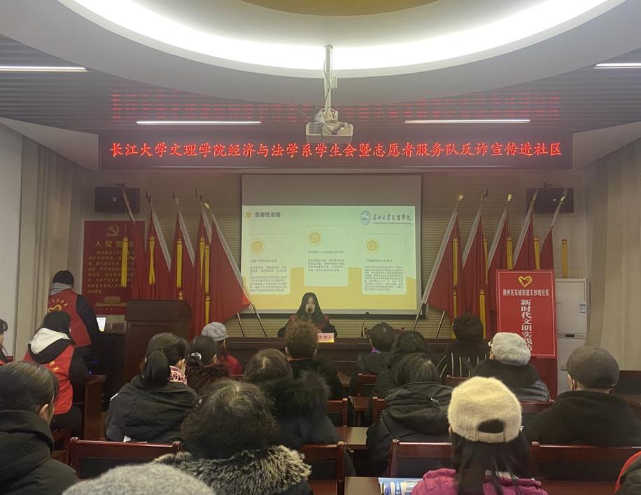 本网讯(见习记者:孙海蕴)在这个网络信息化的时代,网络信息真假难辨,为提高老年人的警惕性和对于虚假信息的辨别能力,避开诈骗的陷阱,经济与法学系于12月21日受邀前往荆州市荆州区东城街道玄妙观社区为社区老人开展防诈骗讲座,并进行防诈骗知识宣传。本次活动由经法系团总支联合学生党支部开展相关主题教育。