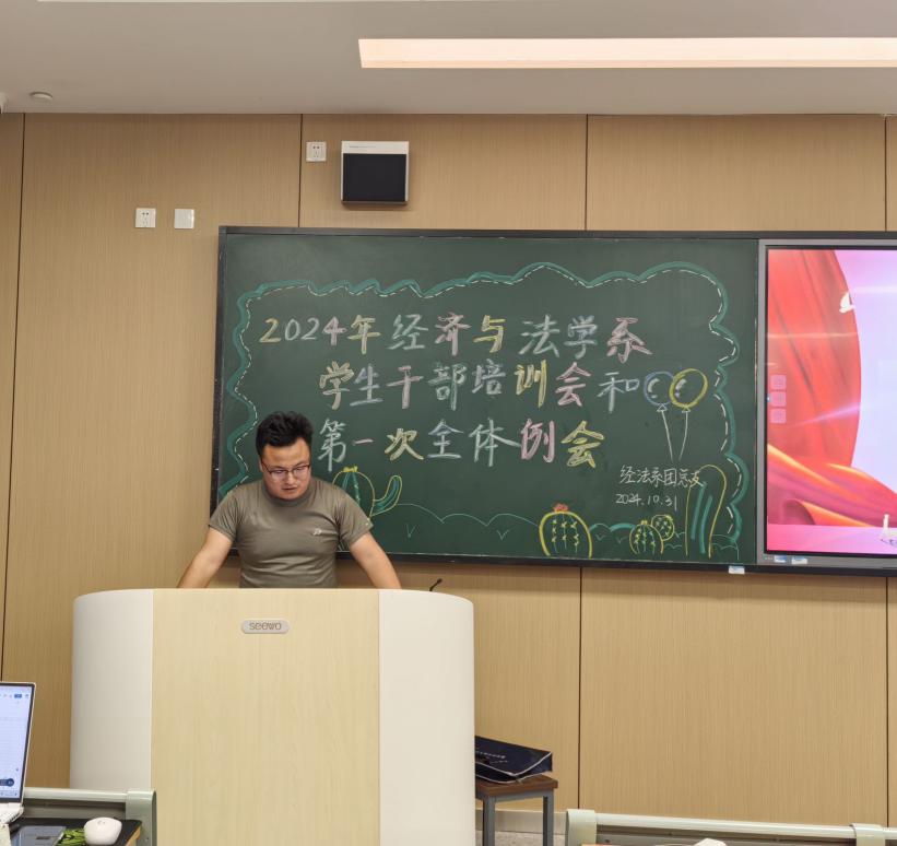 本网讯(见习记者:刘兴俊 余好)为了让全体学生干部尽快适应工作,提高工作能力和办事效率,促进系部的发展与建设。经济与法学系于10月31日下午6点在a-309召开学生干部技能培训会和第一次全体工作例会。经法系辅导员黄春桥受邀出席本次会议,经法系团学组织全体成员以及24级各班班委共同参与。本次会议由组织部部长骆灿主持。