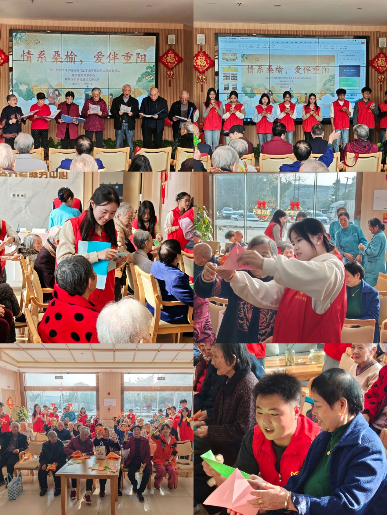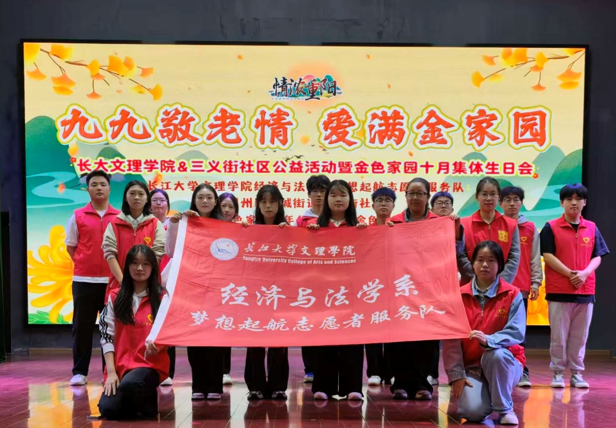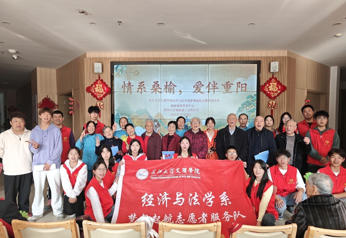 本网讯(见习记者:陈世行 张馨予)岁岁重阳,今又重阳。为弘扬中华民族尊老敬老的传统美德,传承重阳节深厚文化内涵,增强青年学生的人文关怀意识和社会责任感,经济与法学系延续重阳节志愿服务优良传统,于10月组织梦想起航志愿者服务队,先后走进荆州市沙市区金色家园老年公寓、荆州市荆州区城发康养城南御苑社区养老服务中心,开展主题敬老志愿服务活动,为老人们送上满含心意的节日关怀。