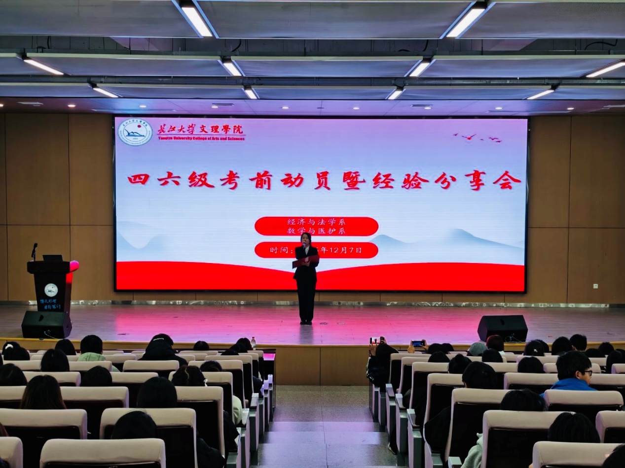 本网讯(见习记者:陈世行)为切实解决同学们在英语四六级备考过程中面临的困难,明确复习方向,凝聚迎考信心,12月7日,经济与法学系联合数学与医护系于报告厅B-112共同举办英语四六级动员暨经验分享会。会议特别邀请了数学与医护系党总支副书记燕梦蝶担任主讲老师,经济与法学系辅导员卢佳智、刘曼莹、滕宋云,2024级全体学生及2025级部分学生代表参加本次会议。本次会议由秘书处何俊雯主持。