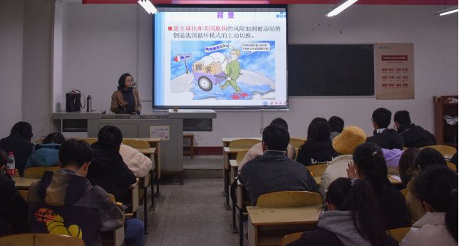 当天晚上,吴雪莲副教授以“推进贸易高质量发展 促进国内国际双循环”为题,给经法系的学生们带来了一场精彩的学术报告。报告从贸易高质量发展的背景、发展战略,到对外贸易发展的现状和遇到的问题,探讨新时期的贸易高质量发展背景下,当代大学生应秉持创新思维,延伸学习链,提升个人发展优势。