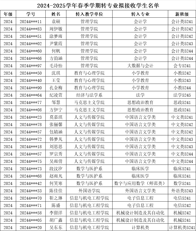 根据《williamhill官网专业分流与转专业管理办法》(文理行发〔2023〕64号)精神,按照转专业相关工作要求,经学生本人申请,招生处及所在教学单位审核,申请转入教学单位综合考核,教务处复核,拟同意袁硕等29名同学转入新专业学习,现将结果予以公示(见附表)。