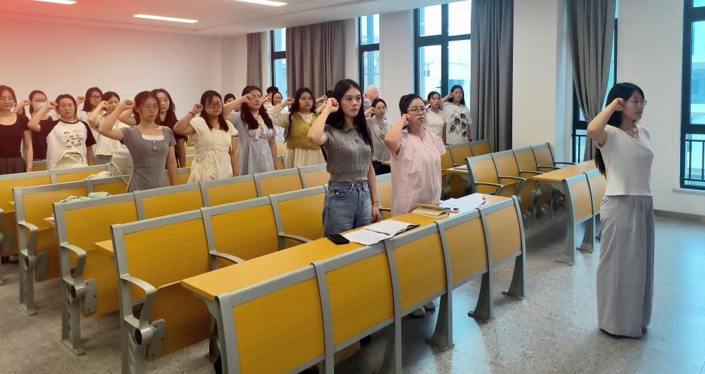 “我志愿加入中国共产党……”在李诗羽同志的领誓下,全体党员面向党旗庄严宣誓,洪亮的誓言回荡在会场。这是一次跨越时空的初心对话——从第一次在党旗下庄严承诺,到毕业前的重温洗礼,教育与心理学院毕业生党员们用不变的誓言彰显着“听党话、跟党走”的坚定信念。
