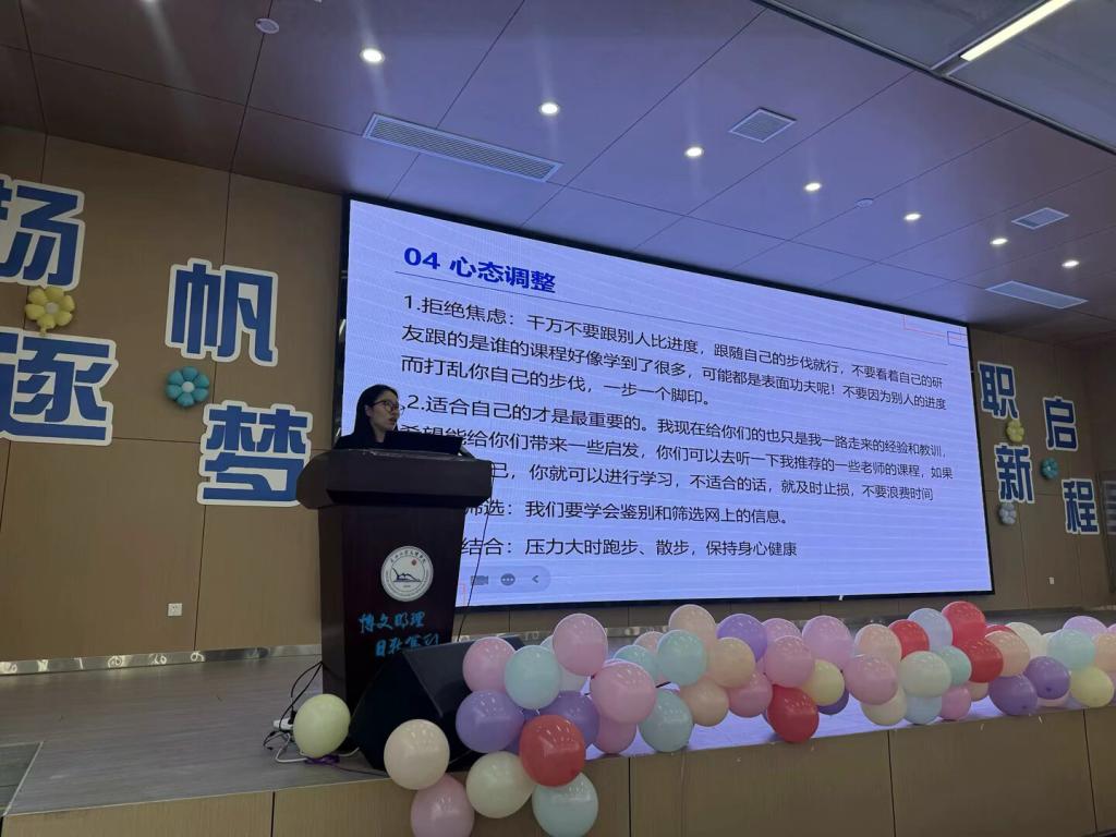 5月20日下午,优秀毕业生代表,学生党员叶清清及优秀毕业生刘丹两位同学,为22级全体同学分享了在校期间的学习成长经历与感悟,表达了她们对党组织培养的感激之情及未来继续发挥党员先锋模范作用的坚定信念,引发全场共鸣。叶清清回首了自己考研之路,表示那是一段布满荆棘却又无比珍贵的旅程,尽管也曾迷茫和焦虑,但作为一名党员,她深知“功崇惟志,业广惟勤”,既然选择了考研这条道路,就必须坚定信念,勇往直前,希望同学们都能在考研的道路上勇往直前,收获属于自己的成功!