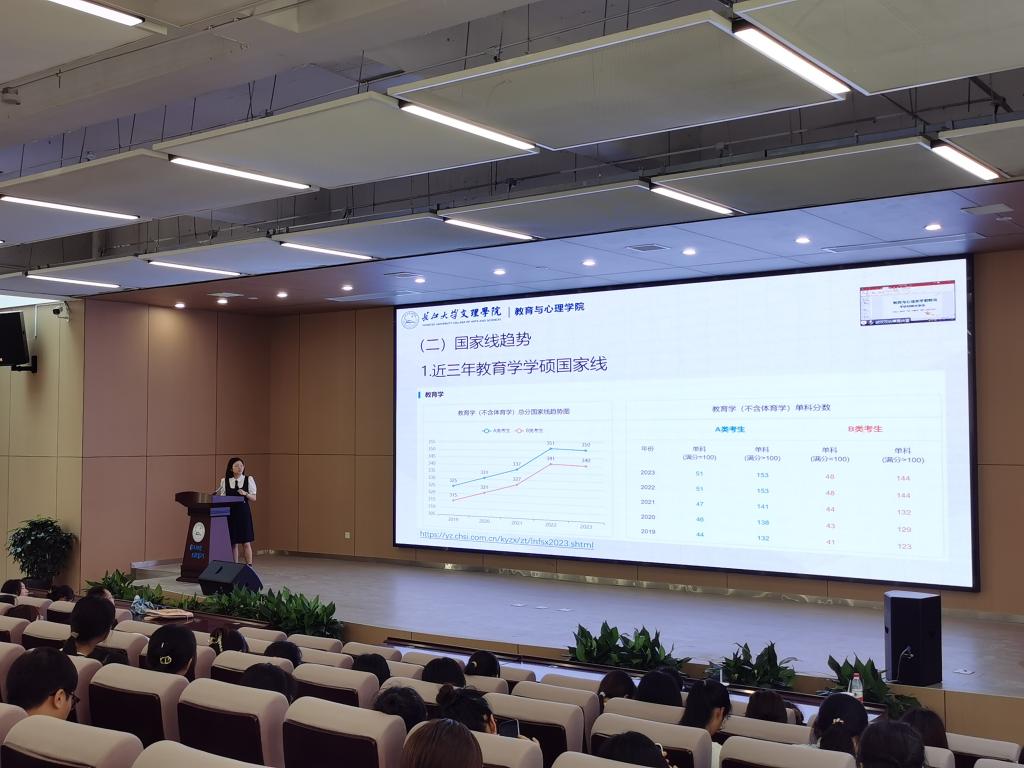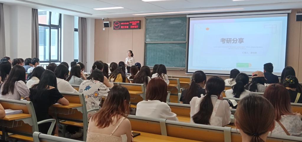 学前教育专任教师廖晨雨从近三年考研形势、目标院校的选择、学前教育专业可选择学校等方面进行了介绍。面对目前考研人数不断攀升、录取分数不断提高的现状,学生需根据自身能力、兴趣、未来就业方向等谨慎选择合适的目标学校。随后,今年考取长江大学的胡双双同学通过视频连线的方式,从专业的选择,备考时间的安排以及英语、政治、专业课等科目的学习方法与现场的各位同学进行了经验分享。