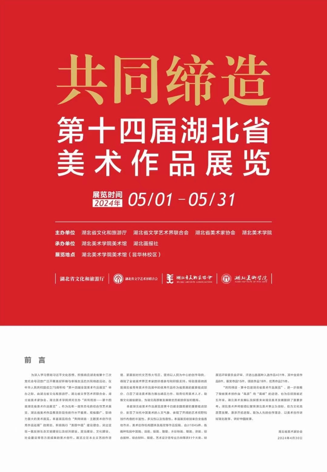 本届美术作品展览由湖北省文化和旅游厅、湖北省文学界联合会、湖北省美术家协会、湖北美术学院共同主办。作为五年一届常态化的综合性艺术展览,湖北省美术作品展是阶段性创作水平最高、规模最广、影响力最大的美术展览。