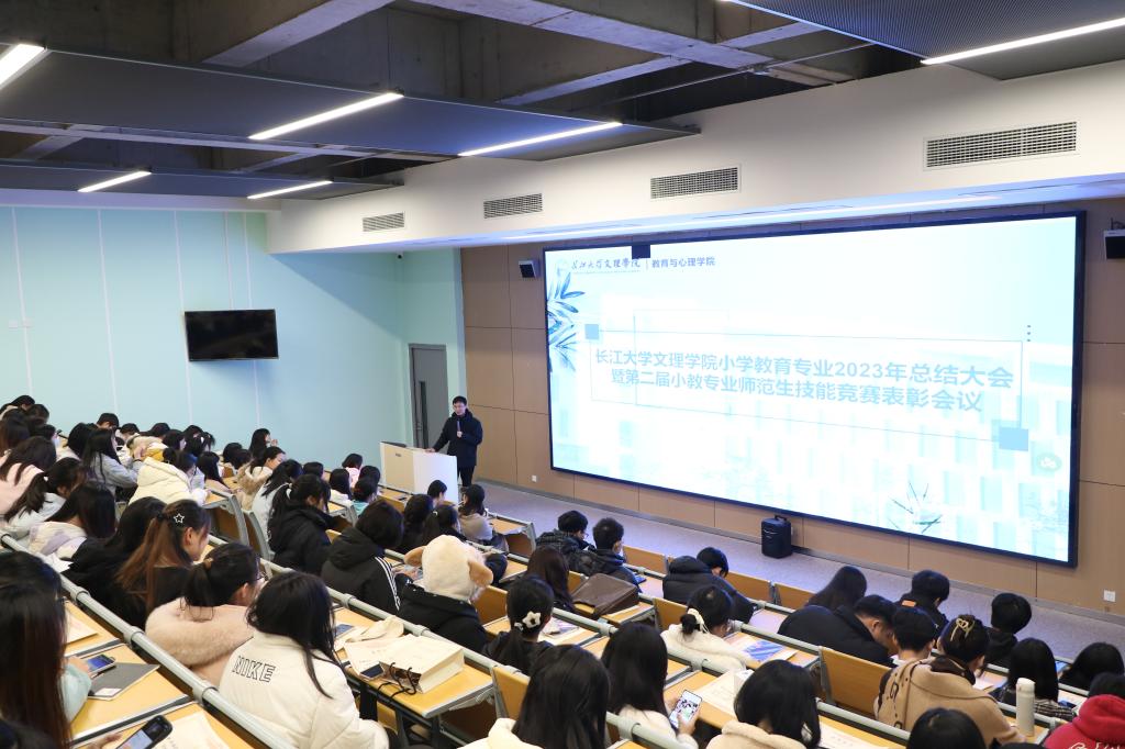 本网讯(通讯员 杜慧)为了全面总结我院小学教育专业在过去一年所取得的成绩,1月4日下午6点,教育与心理学院小学教育专业在教学楼B214教室举行2023年总结大会暨第二届小教教育专业师范生技能竞赛表彰会。教育与心理学院院长徐霄、小学教育专业部分教师、辅导员及全体学生总结大会。
