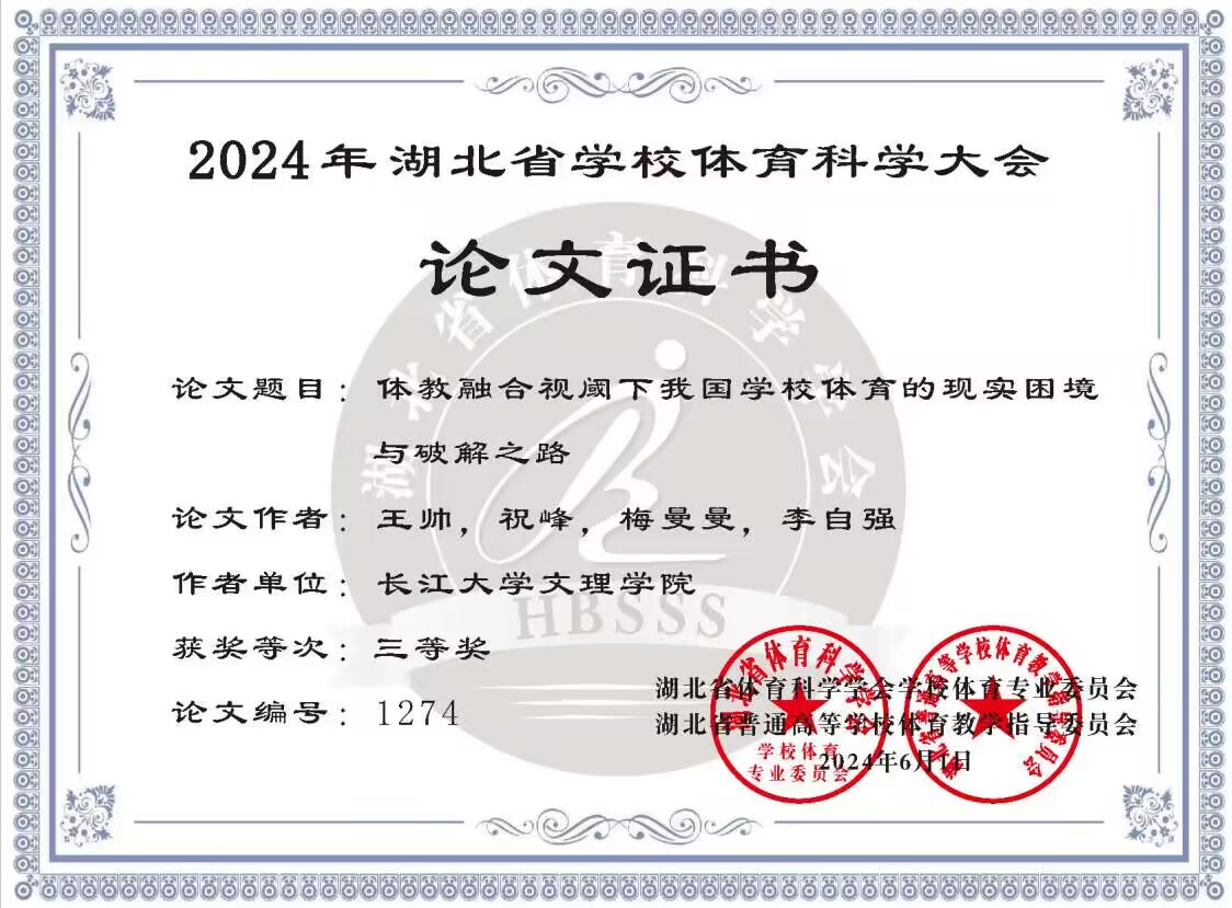 据悉,本次大会共收到来自全省各有关单位和个人报送的论文1741 篇,经论文学术不端系统检测、人工筛查和专家评审等程序,录取论文1082 篇,williamhill官网教育与心理学院教师王帅、祝峰、梅曼曼等人撰写的论文《体教融合视阈下我国学校体育的现实困境和破解之路》获三等奖。