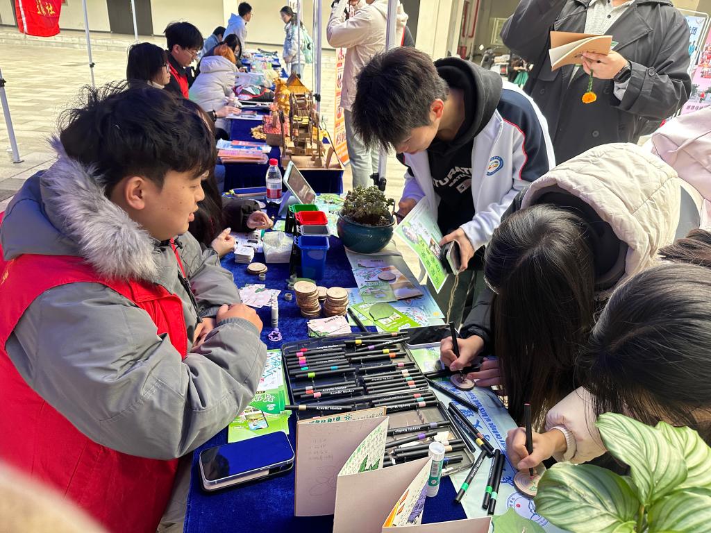 展区内,以原创IP形象和绿色生态为灵感设计的系列文创作品整齐陈列,憨态可掬的造型与环保主题的巧妙融合,吸引了大批参观者。团队精心设计的互动小游戏,将环保知识融入趣味体验,让参观者在轻松玩乐中加深对绿色生活理念的理解。“智护绿芽——社区AI云养计划”运用数字化思维,打造线上线下联动的公益模式,通过亲子垃圾分类、环保漆扇制作、纸浆画等多样化活动,推动绿色理念真正融入日常生活。