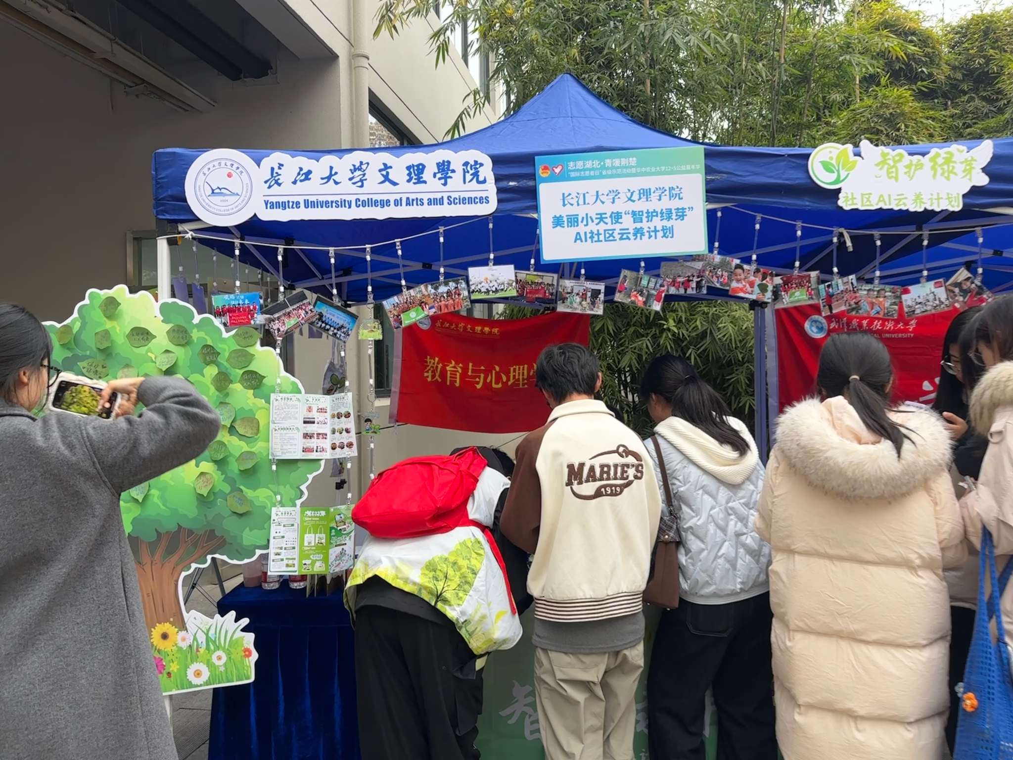活动现场,“美丽小天使”志愿服务队以“智护绿芽——社区AI云养计划”为核心,通过展板图文解读、文创周边展示、趣味互动讲解等多元形式相结合,全方位呈现团队在环保教育与数字化公益领域的特色成果。