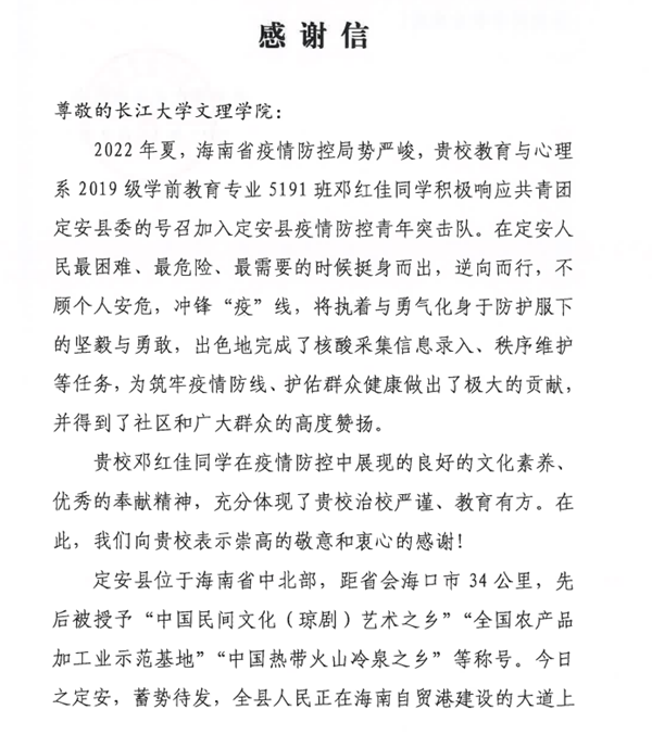本网讯 近日,共青团定安县委员会发来感谢信,对我院教育与心理系学前教育专业5191班邓红佳积极参与海南省疫情防控工作的行为予以表彰。