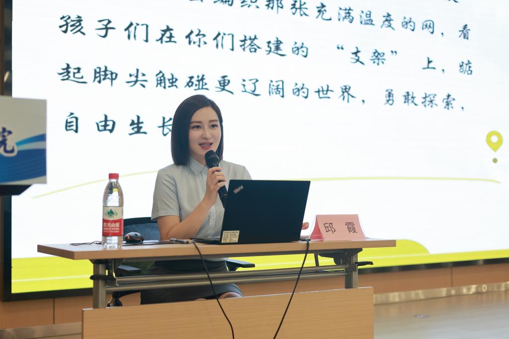 邱霞从“如何打造安全且富有生机的幼儿园环境”“怎样提升幼儿团队协作”“如何平衡教师引导与幼儿自主性”三个问题切入,从实践角度详细解答。她从幼儿园环境与教育的关系、环境创设六大原则、环境功能与创设差异性三个方面深入浅出的阐释了幼儿园环境的教育价值,指出幼儿园环境是“教育有机体”“动态教科书”,要通过精心规划和功能分区构筑成长场域。互动环节,她带领学生将普通纸箱转化为教育资源,探索创新路径。她寄语学子:怀揣教育热忱,为儿童搭建自由探索的“支架”。