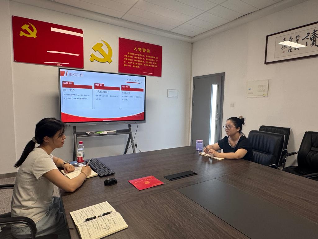 会上,祝峰强调了辅导员自我能力提升的重要性,为两位辅导员指出可以研究的学工课题方向,并对课题撰写的方式方法进行了分享。同时,梅曼曼针对暑期留校同学管理工作进行了强调和部署,要求辅导员对暑期留校学生进行每日安全打卡,了解学生在校情况,确保留校学生人身安全。