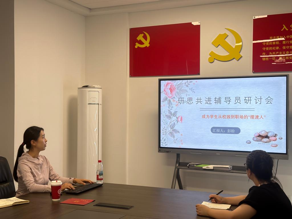 (通讯员 图文/李晓怡)7月9日下午,我院学工队伍在会议室开展第三期“研思共进”辅导员学习交流会,教育与心理学院党总支书记祝峰,副书记梅曼曼及辅导员李晓怡、彭盼参会。