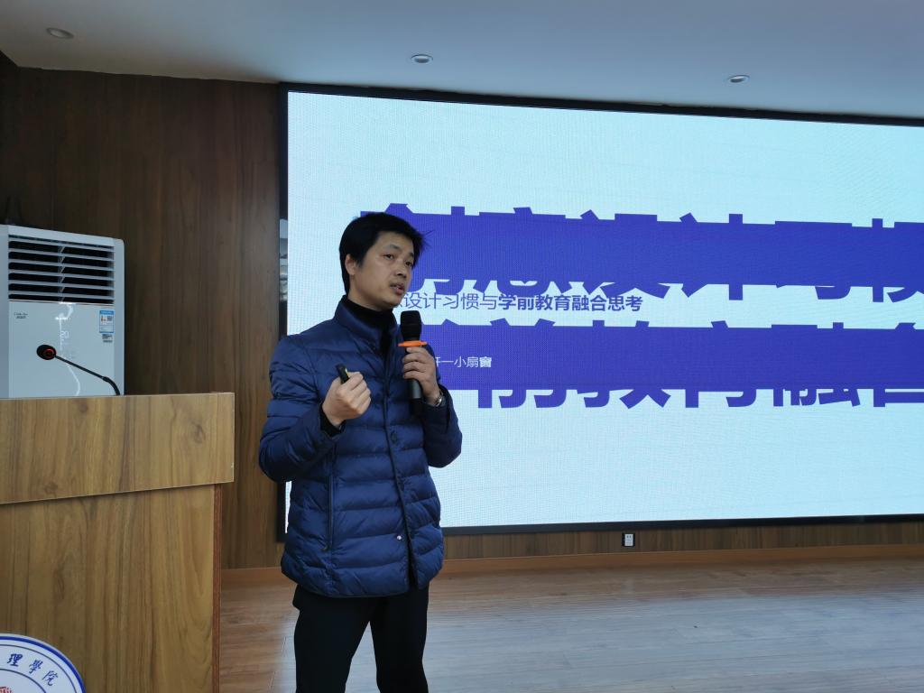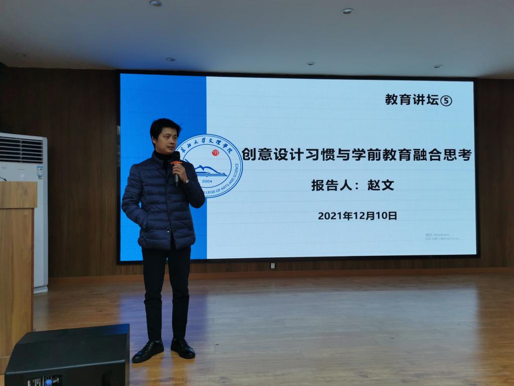 赵文以“创意设计习惯与学前教育融合思考”为题作报告。他从国家政策、人才培养、学科专业建设层面强调了现在是学前教育专业发展的关键时期,而培养创新创意思维习惯对于培养研究型、艺术型的学前师资力量具有重要意义。并从六个方面阐述了创新创意思维的路径和方法。在互动环节,赵文针对学生提出的问题一一进行了解答。