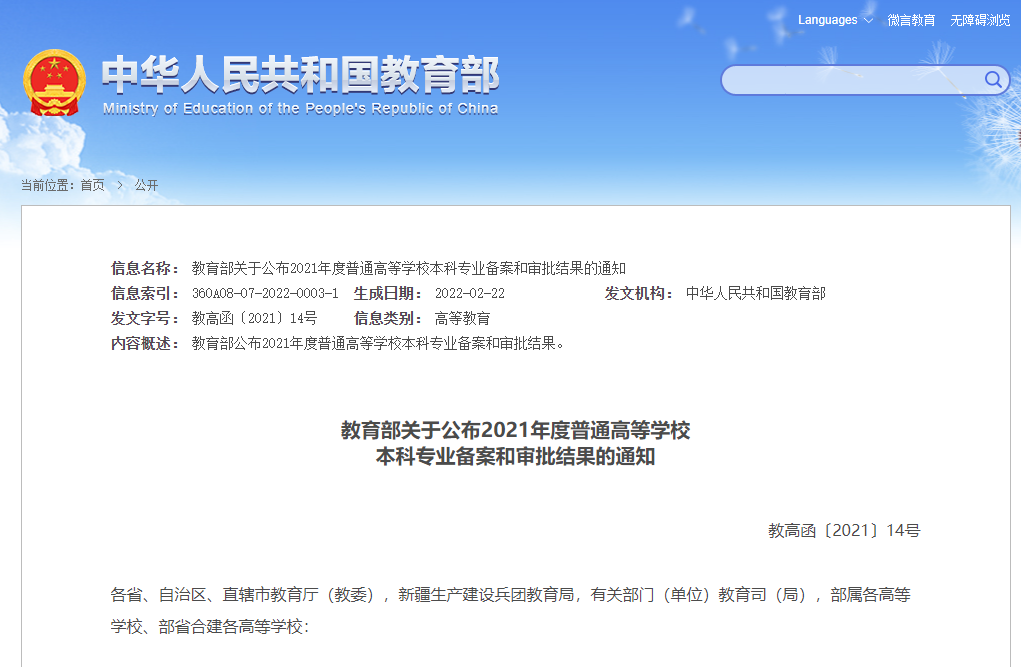 近日,教育部印发了《育部关于公布2021年度普通高等学校本科专业备案和审批结果的通知》(教高函〔2021〕14号),我系申报的小学教育本科专业通过教育部审批。