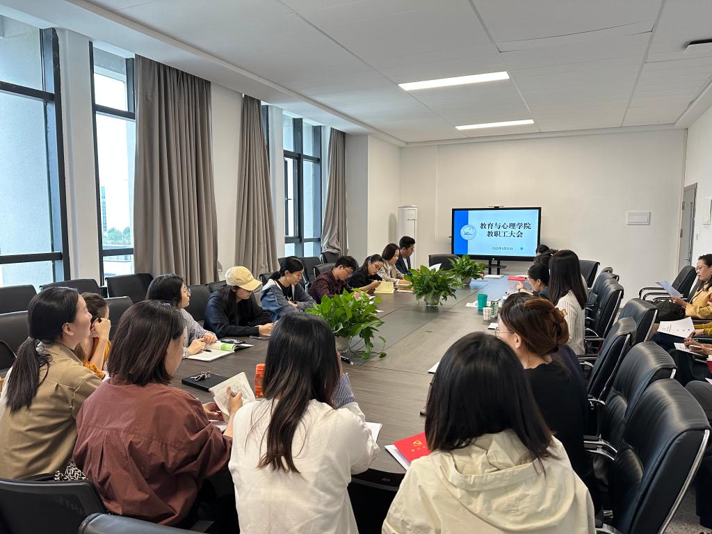 本网讯(通讯员刘心)9月21日,我院在教学楼JY304会议室召开9月教职工大会。会议由教育与心理学院院长徐霄主持,全体教职工参会。
