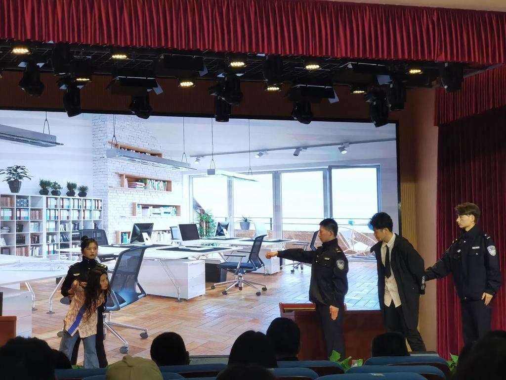在情景剧表演中目紧扣主题,通过诙谐、生动的表演把“杀猪盘”“网络游戏诈骗”这些具有代表性的网络诈骗方式直观的呈现在同学们面前;节目内容别出心裁和表演妙趣横生,让同学们在欢声笑语中获得防诈骗技巧,提升防诈能力。