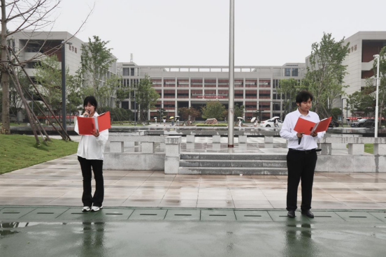 在细雨中,国旗护卫队昂首阔步,动作整齐划一,随着国歌的奏起,五星红旗缓缓上升,迎风飘扬。接着,学生代表范怡然、朱颖在国旗下朗诵《百年芳华》,其中提到的“红船精神〞和“长征精神”贯穿了中国共产党百年奋斗历程,也是我们党的强大精神力量和宝贵精神财富。当代青年不仅要勇于担当使命,更要彰显为国为民的情怀,要敢于无畏前行,善于开拓创新,以科技报国的责任和担当各展所长,在国家发展历程中实现人生理想。
