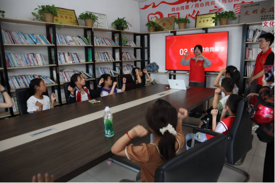 活动现场,志愿者们耐心的带着小朋友们学唱歌曲《万疆》,一词一曲中,道一声信仰仍明,喊一声山河无恙。