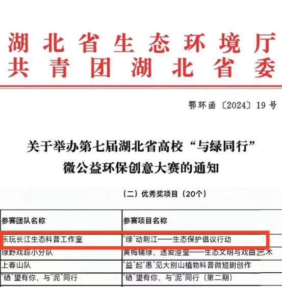 本网讯(通讯记者 梁岚)近日,第七届湖北省高校“与绿同行”微公益环保创意大赛获奖名单公布。williamhill官网人文与传媒学院网络与新媒体专业学生积极参与此次赛事,组建“乐玩长江”生态科普工作室,并以“‘绿’动荆江--生态保护倡议行动”项目荣获优秀奖,为本次荆州市唯一获奖高校团队。