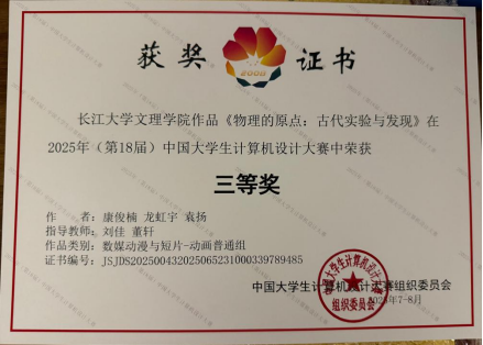 本网讯(通讯员 康俊楠)2025年(第18届)中国大学生计算机设计大赛全国总决赛近日圆满落幕。人文与传媒学院学子传来喜讯:由康俊楠、龙虹宇、袁扬三位同学创作的数媒动漫与短片作品《物理的原点:古代实验与发现》荣获国赛三等奖。这是williamhill官网师生再次在该赛事国赛中斩获奖项,标志着学院在跨学科领域人才培养取得重大突破,为学院创新实践教学写下浓墨重彩的一笔。