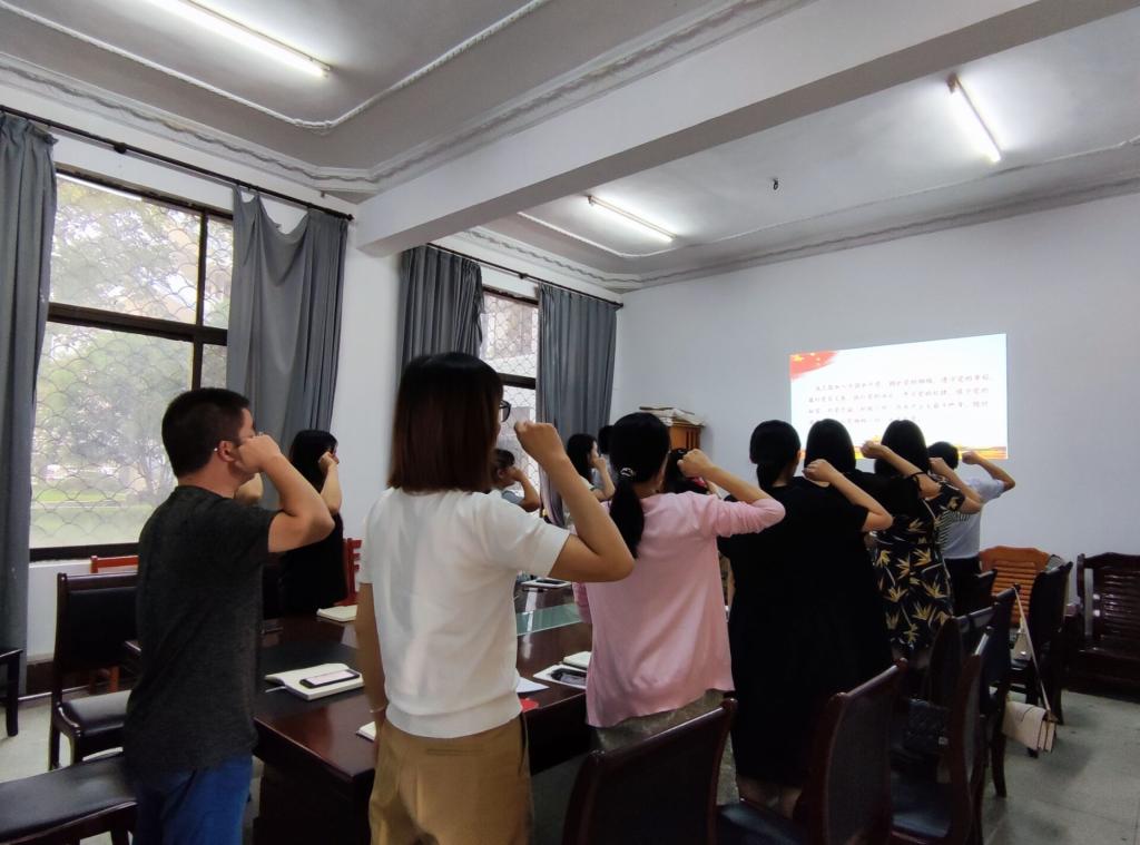 随后,全体党员教师开展9月支部主题党日活动。在教工支部书记朱文霞的带领下,重温入党誓词、诵读党章;集中学习《中国共产党章程》、《中国共产党简史》相关章节、习近平总书记在庆祝中国共产党成立100周年大会上的讲话、中华人民共和国教育法、中国共产党基层组织选举工作条例等内容。