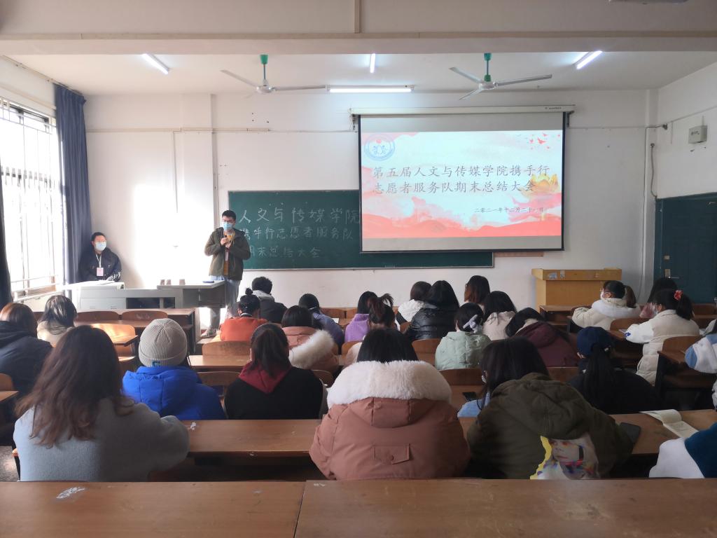 本网讯(学生记者 李来)2021年12月21日,人文与传媒学院携手行志愿者服务队2021年期末总结大会在一教201举行。人文与传媒学院党总支副书记张曦老师,人文与传媒学院团总支副书记黄柳学姐,主席团副主席余昊泽学长、李文杰学长,团总支青工部及携手行志愿者服务队全体成员参与这次会议。会议由青工部部长王艺淇主持。